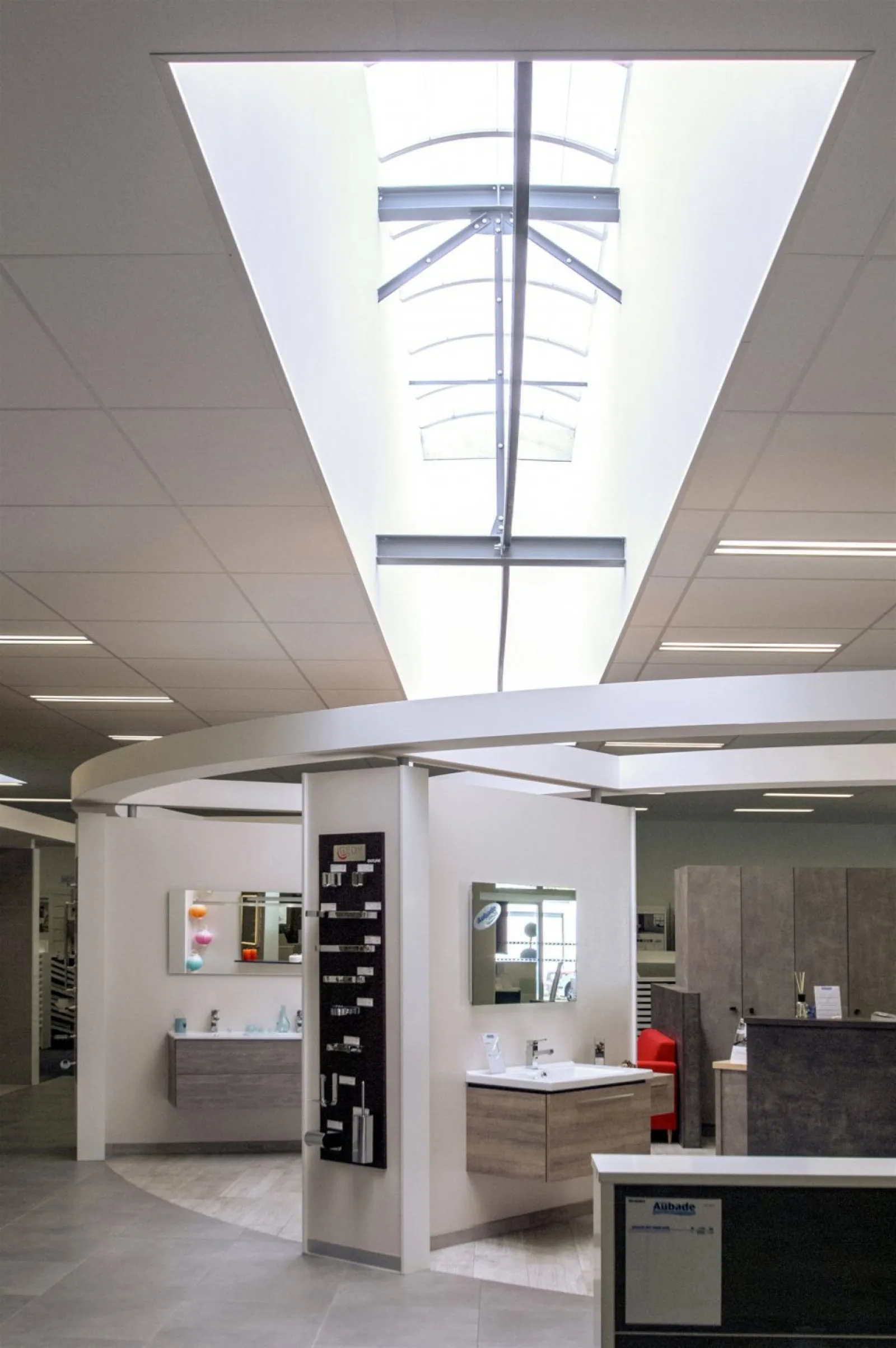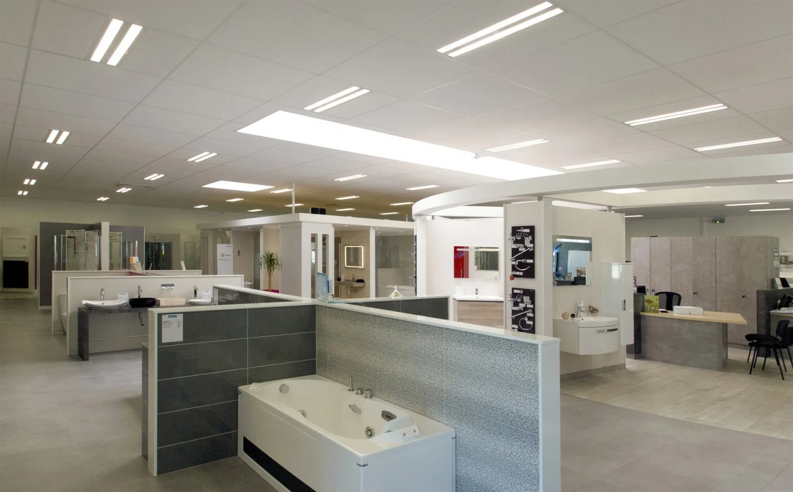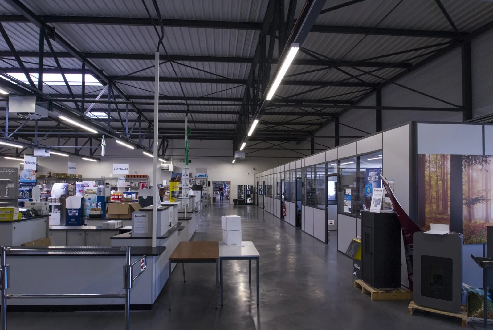 M2C Chantiers a conçu et réalisé ce bâtiment pour le Groupe Aubade, spécialisé dans la plomberie sanitaire. Ce bâtiment de 4 600 m² est doté de 2 600 m² d'espace de stockage, 1 000 m² de magasin professionnel et un impressionnant showroom de 1 000 m². La particularité de ce projet réside dans les fondations spéciales par pieux tubés qui ont été nécessaires pour garantir la stabilité du bâtiment. La charpente métallique, d'une portée de 40 m, a été réalisée pour permettre une grande fluidité des espaces intérieurs.